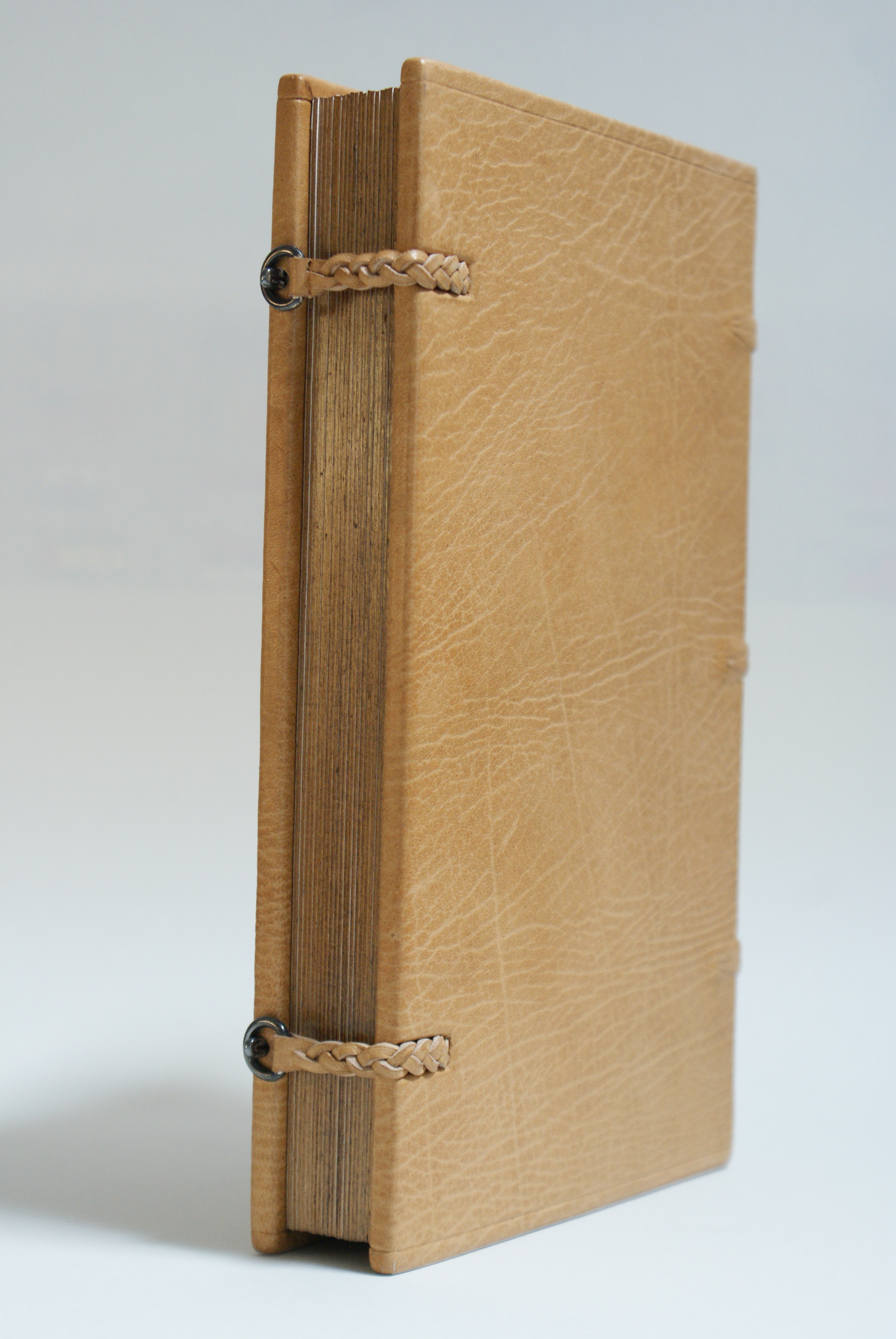 Tarnished silver pin and ring foredge closures with plaited leather straps.