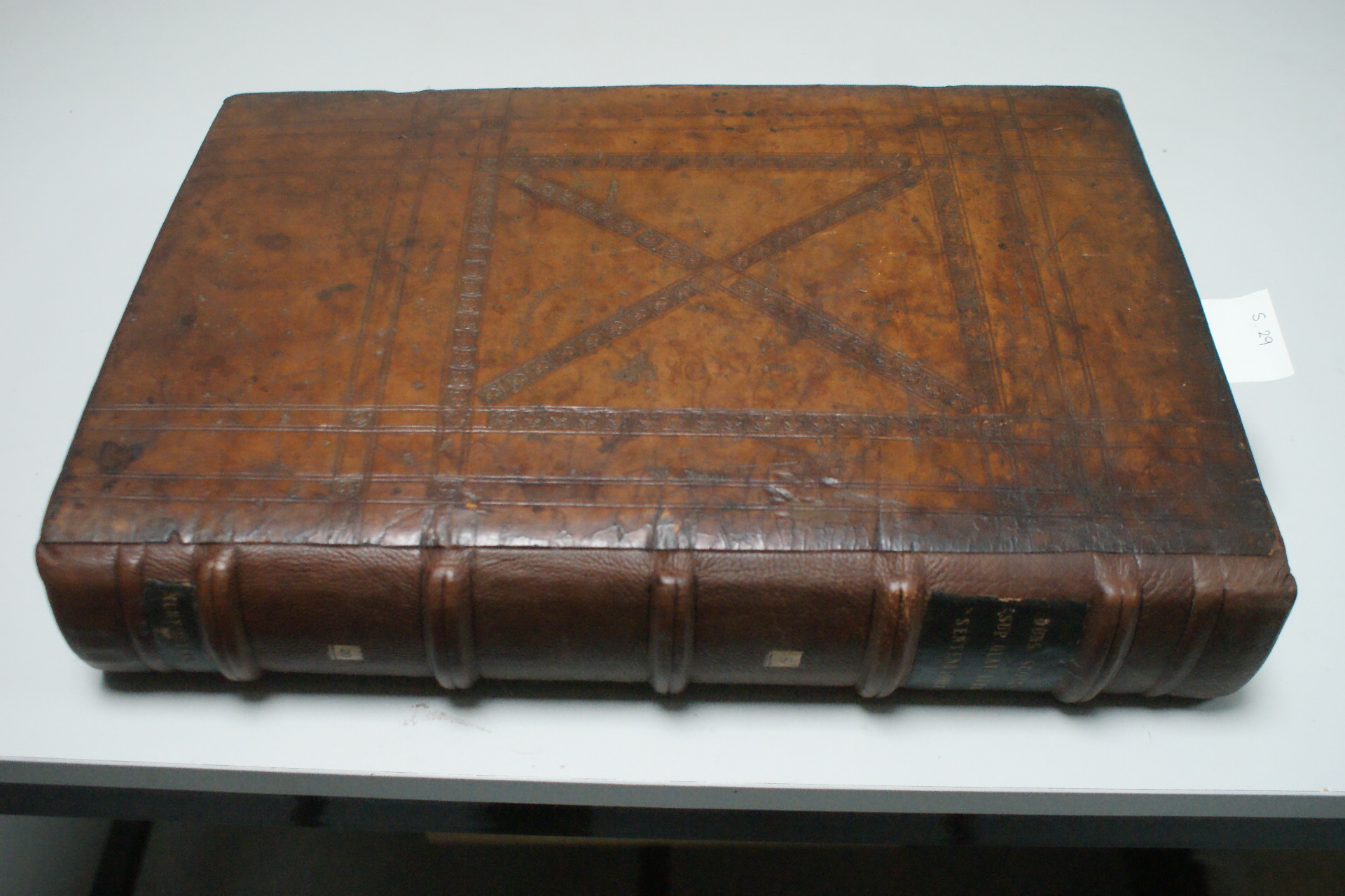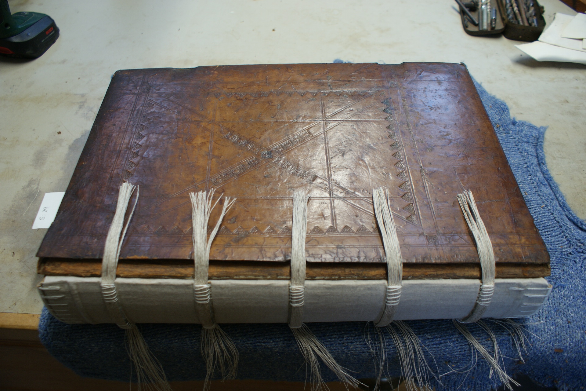 S.29 New braided tapes and linen spine lining to attach boards, and endbands sewn.