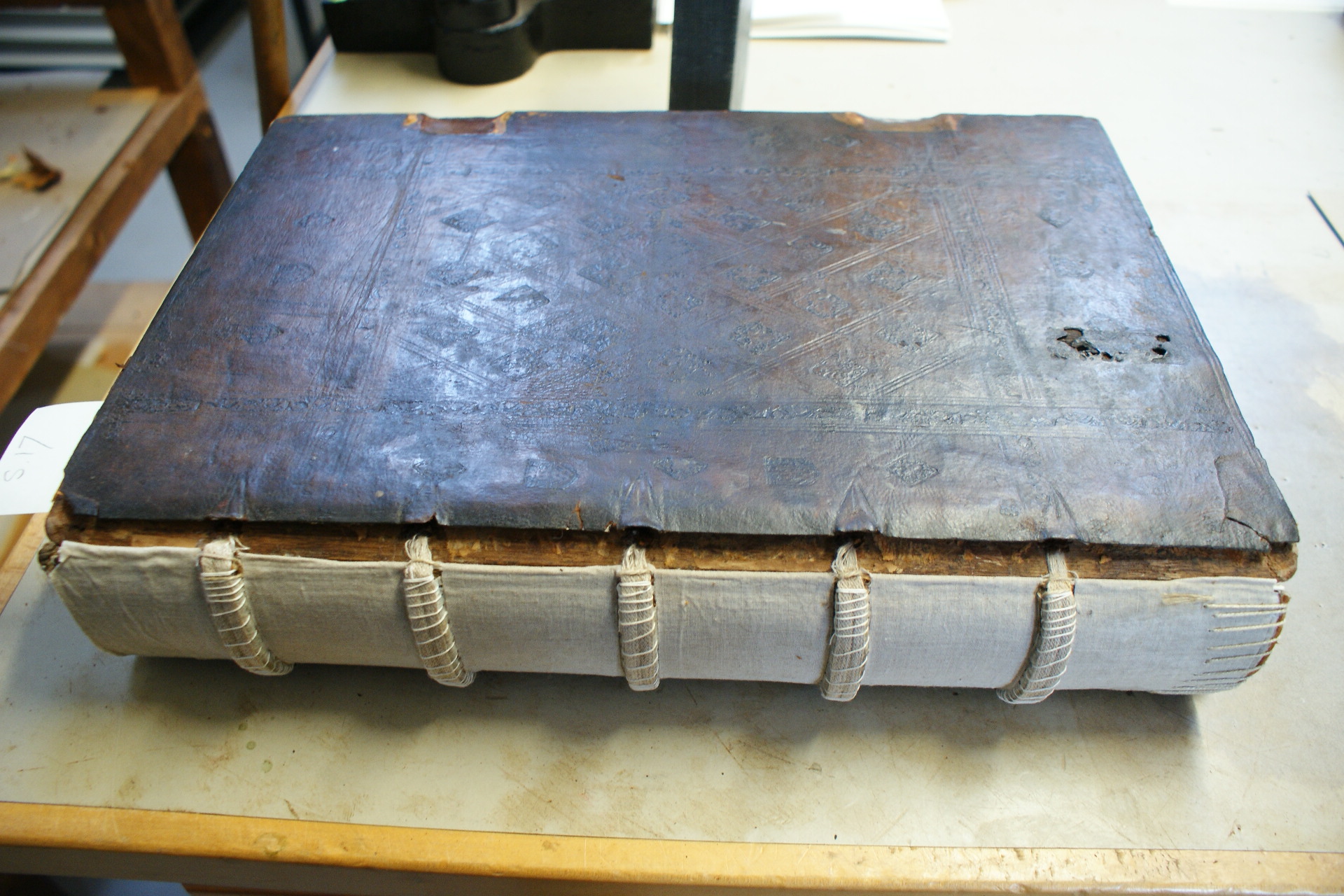 Shrewsbury School benefactors book when received. Note crude brass strips nailed on parallel to the joints securing the previous repair.