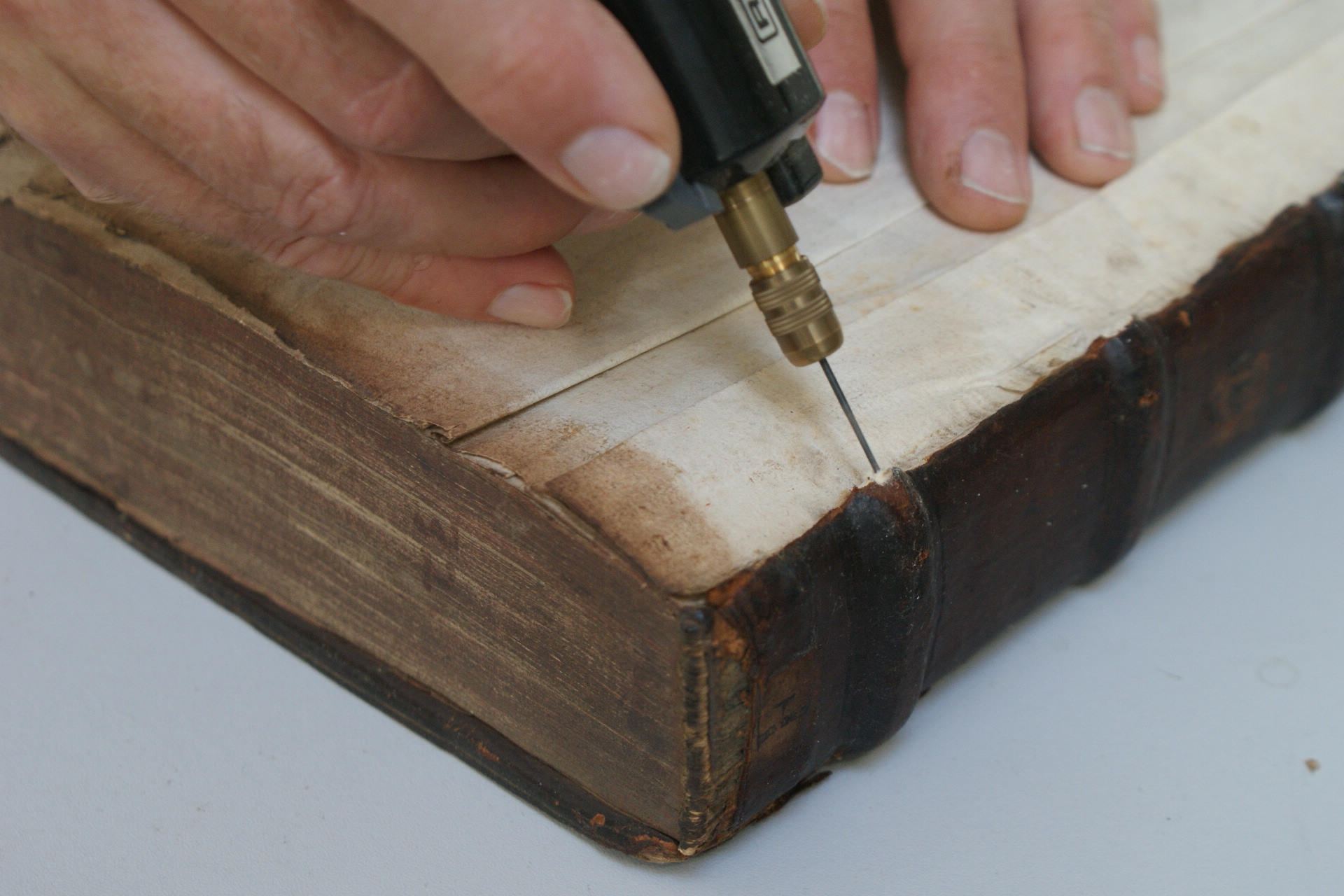 Drilling into the support ends to insert cord extensions. I published this technique in the journal ‘Bookbinder’ 2016.