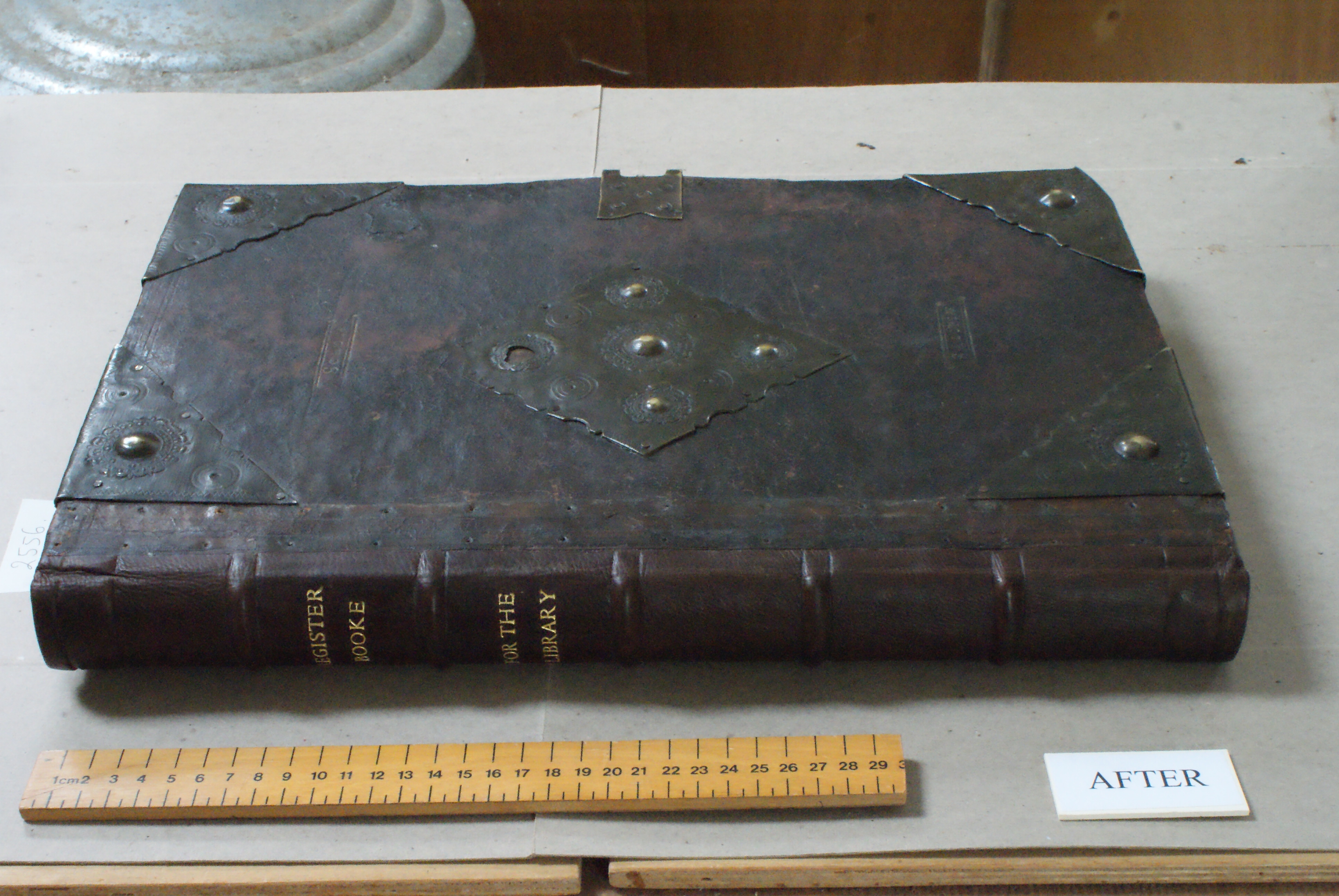 Shrewsbury benefactors book after rebacking and brass strips removed.