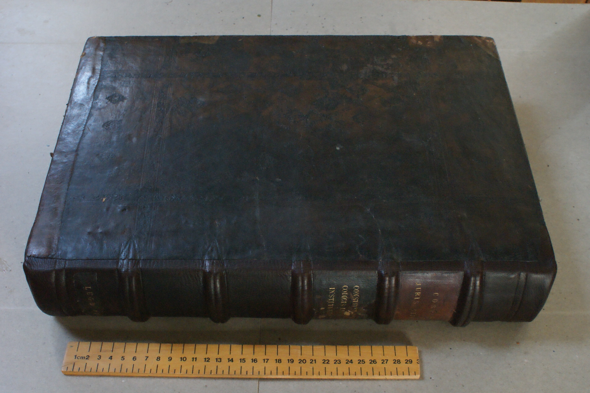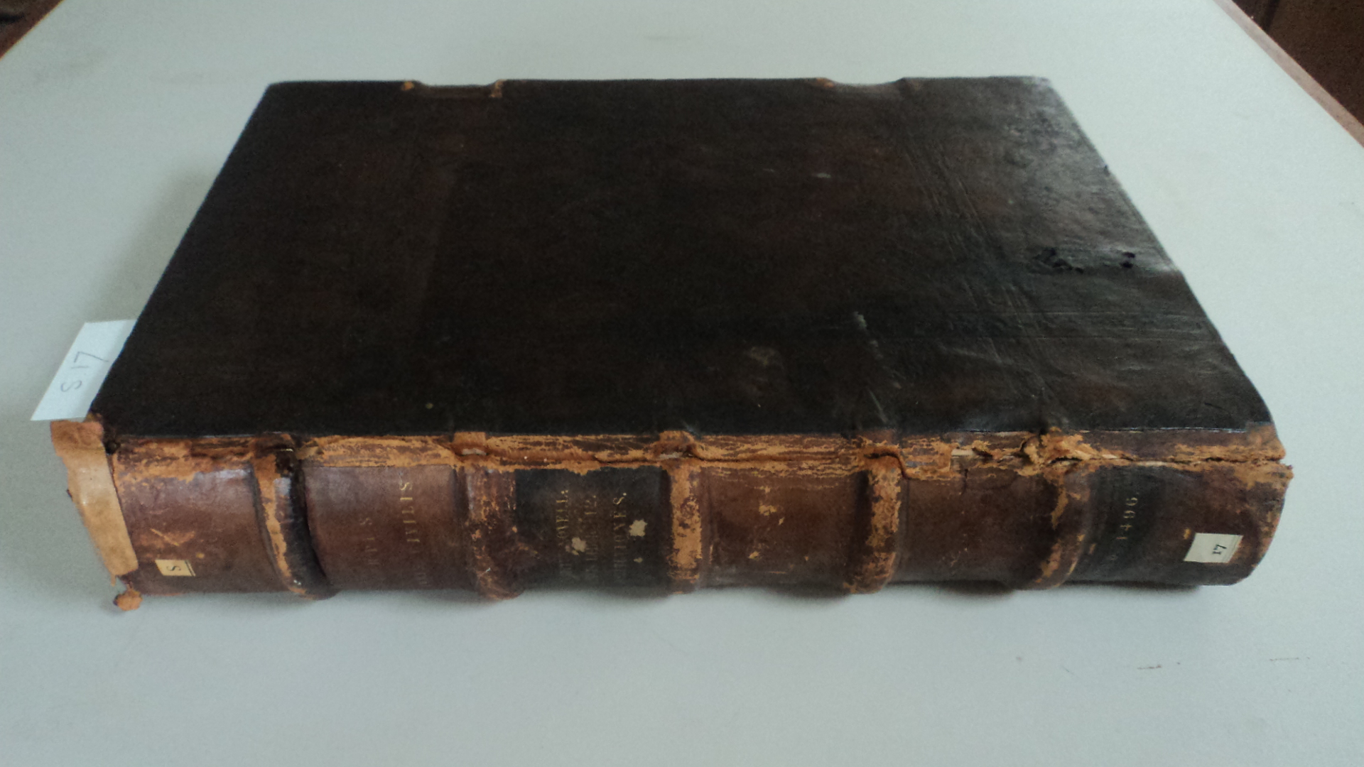 Peterhouse S.17 before repair showing old rotten leather spine leather