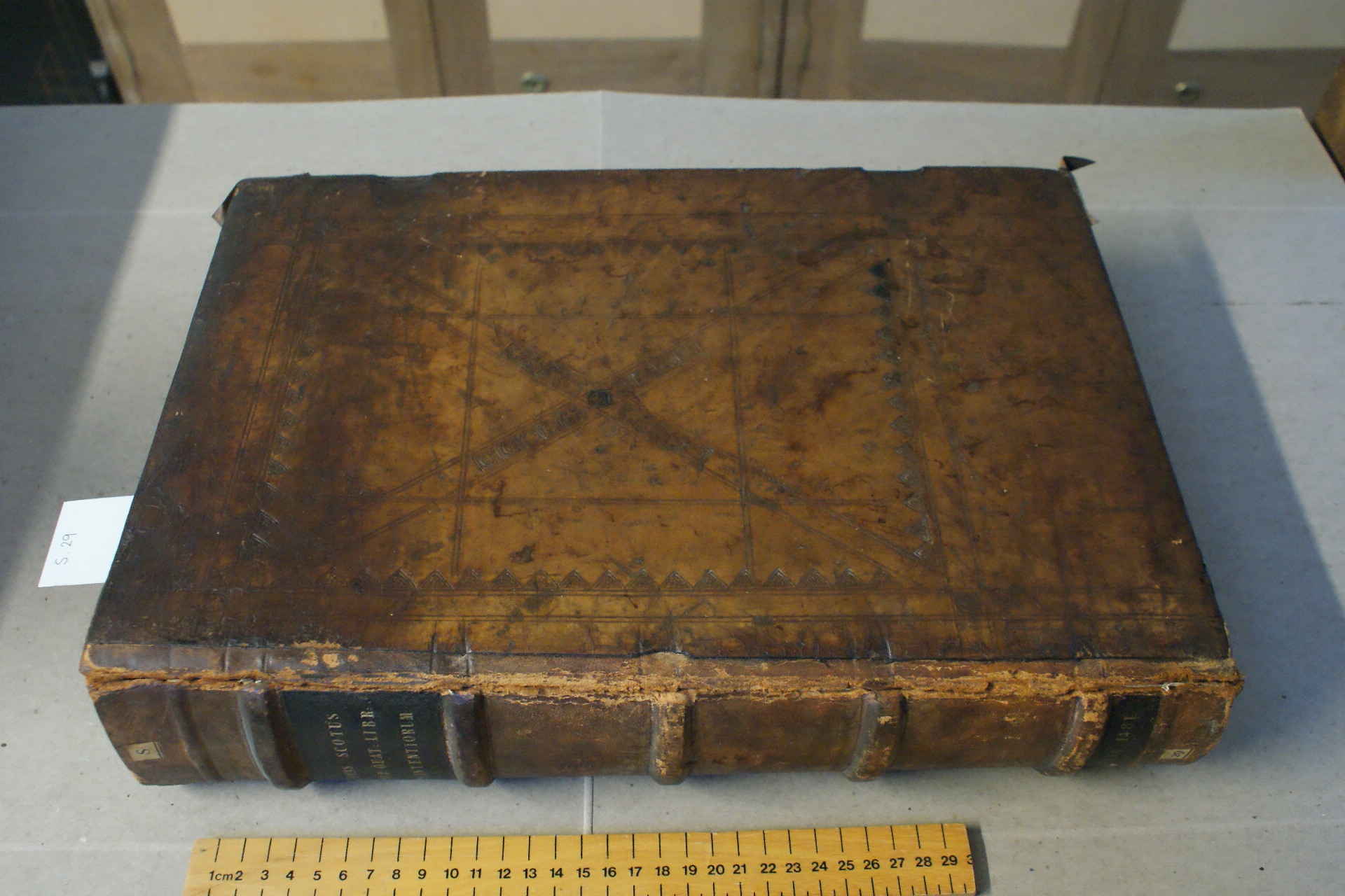 Peterhouse S.29 16th cent vol with oak boards before work showing previous spine repairs.