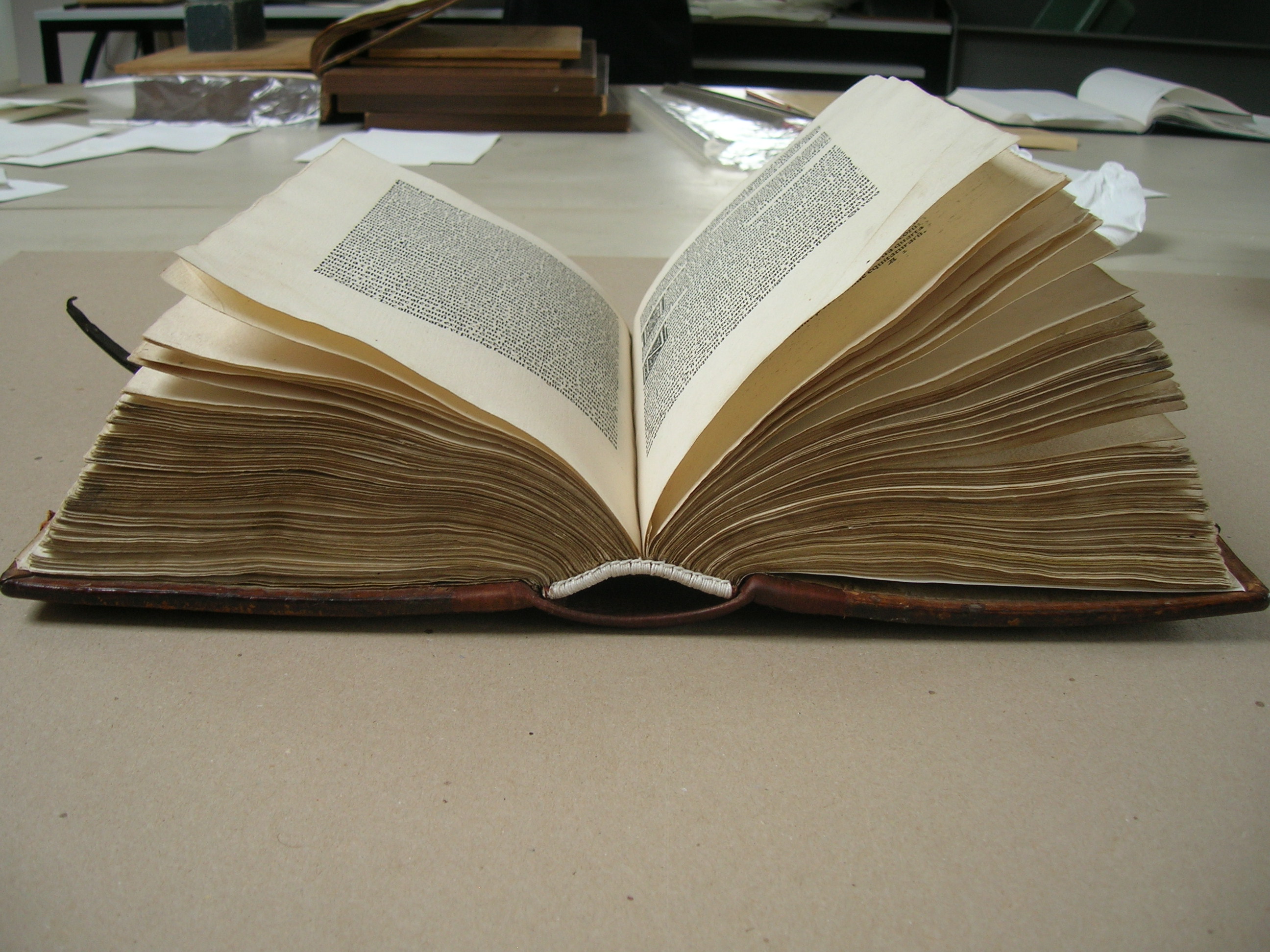 !6th cent. volume resewn and showing opening with moulded paper hollow.