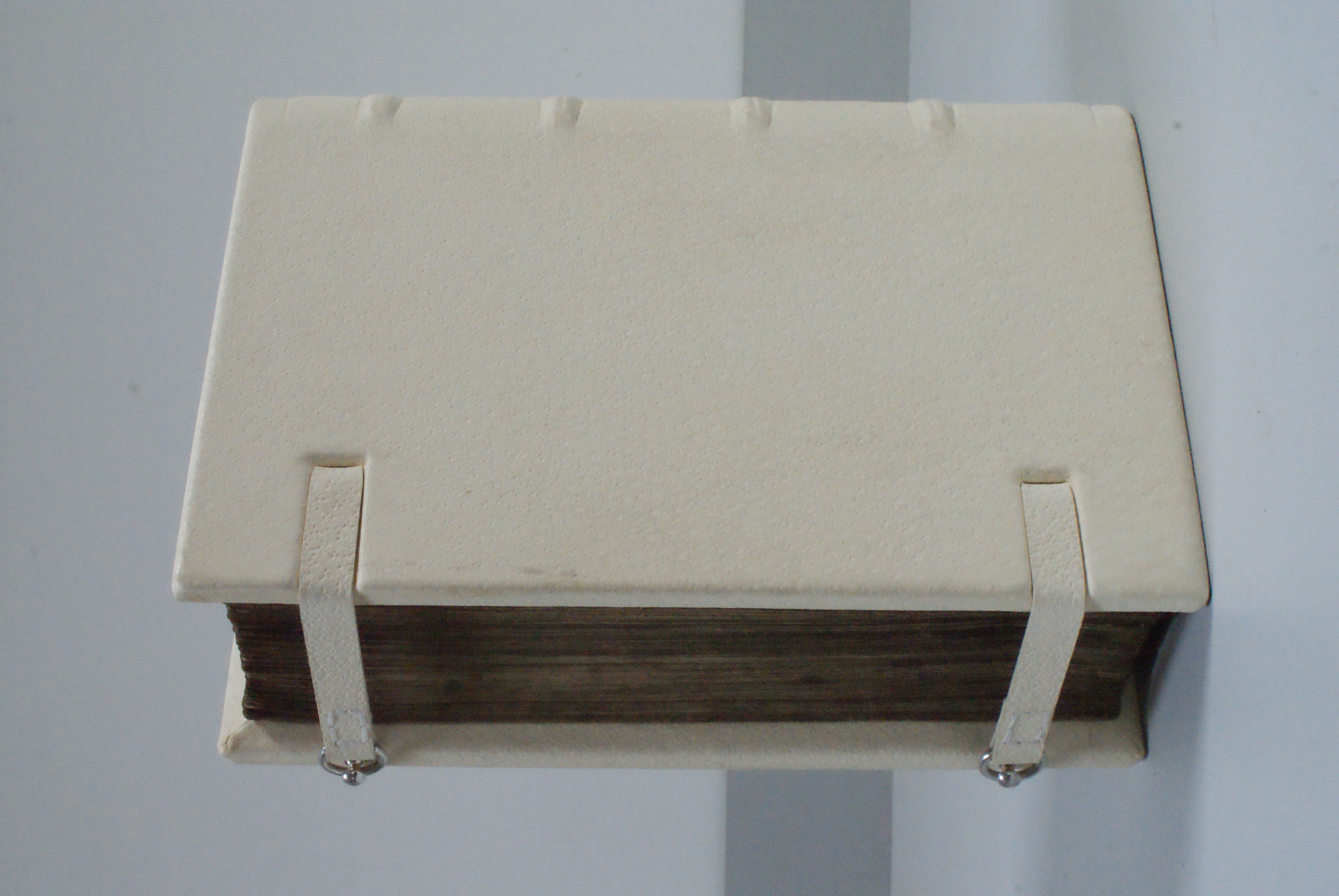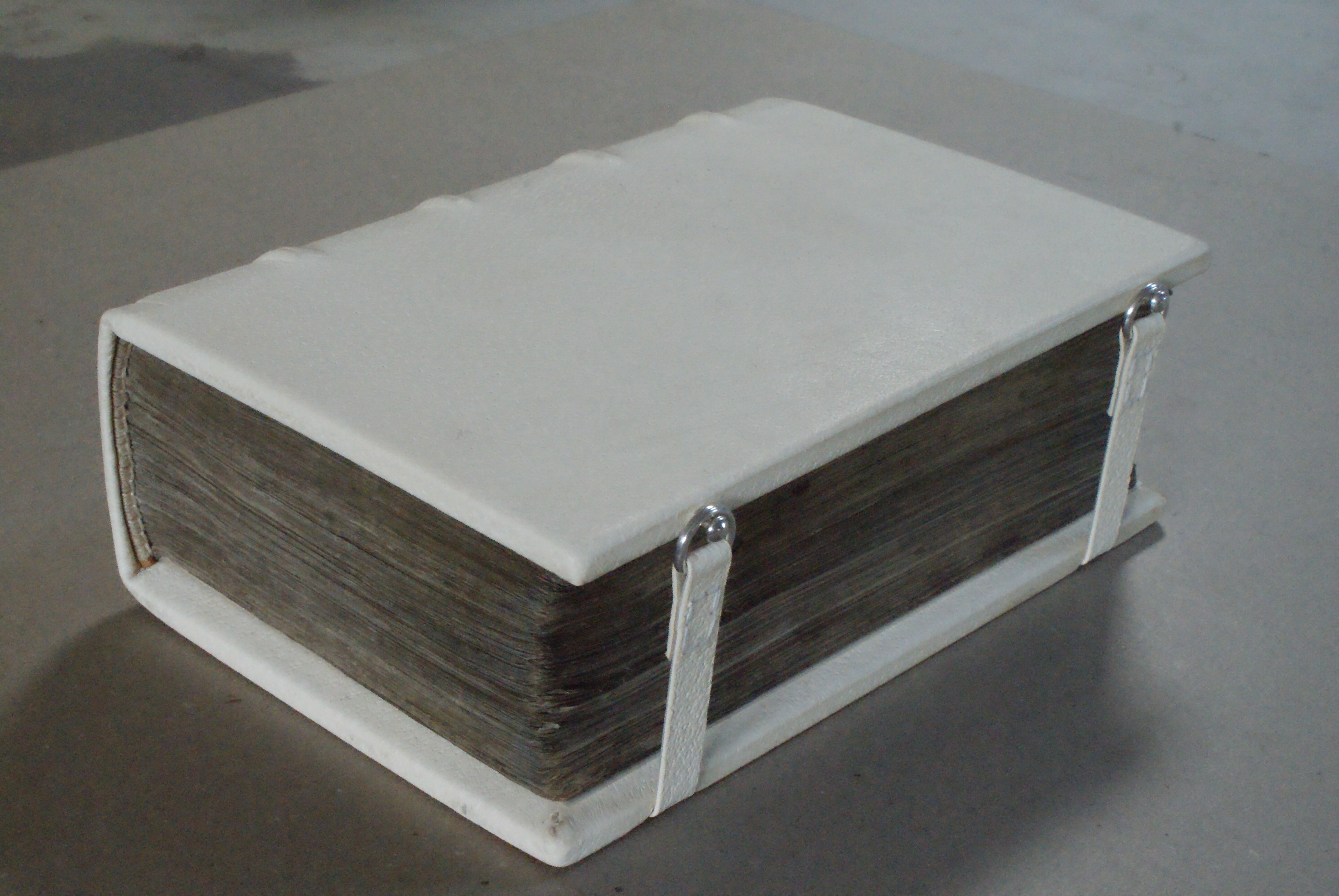 The completed binding with silver pin and ring foredge closures.
